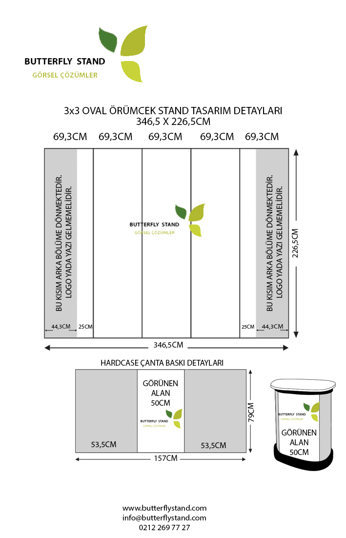 Katıldığınız etkinliklerde portatif şık bir stand arıyorsanız kolay kurulumu ve taşıma rahatlığı ile en çok kullanılan ölçüdür. Örümcek Stand Oval 3×3, 5 panelde oluşmakta olup 2 adet yan panel 3 adet orta panel bulunmaktadır.